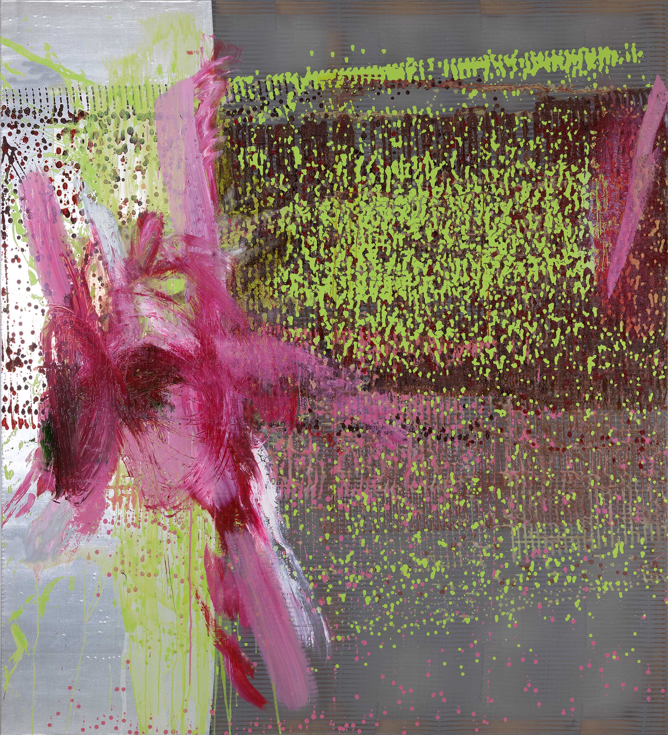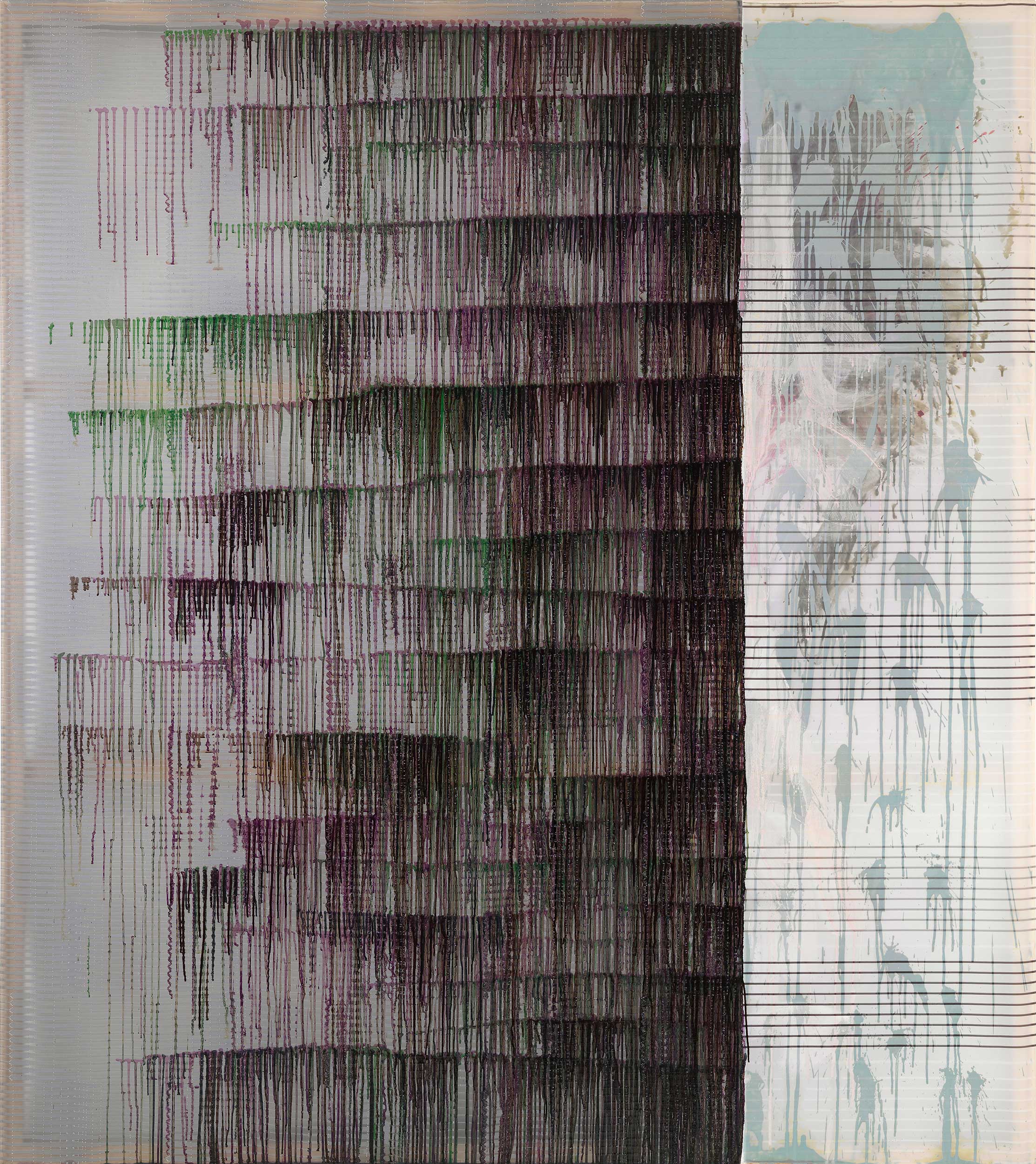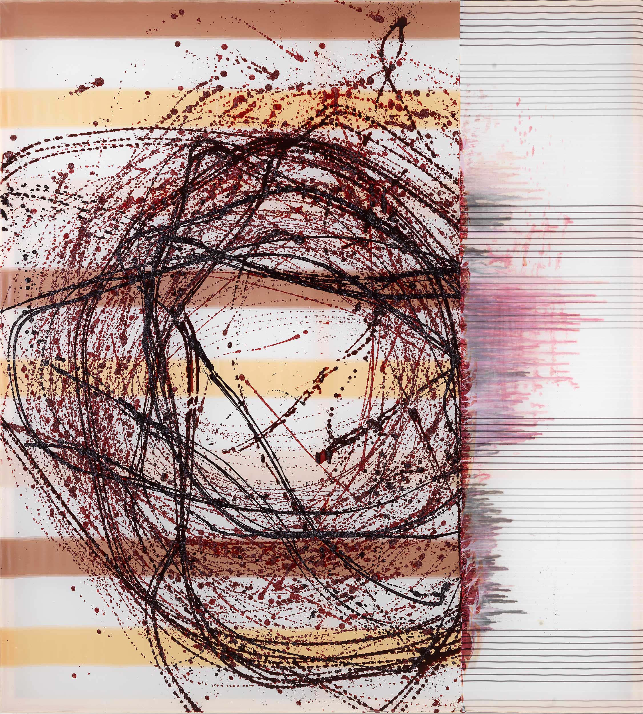kreise in drei ebenen klekse, blau-rot-gelb streifen auf linie linien auf linie linien ausgegependelt schnelle kreise grüner regen