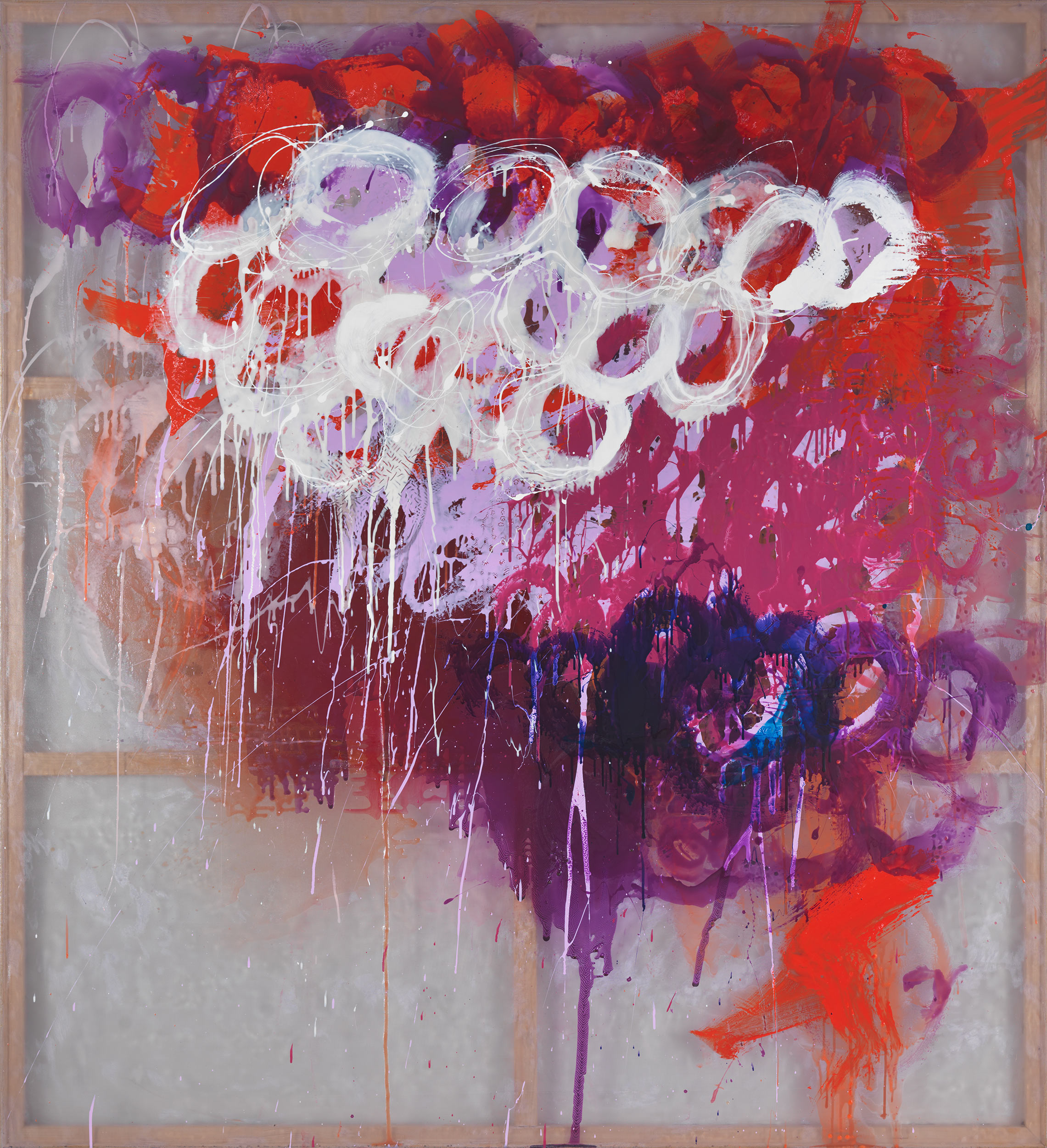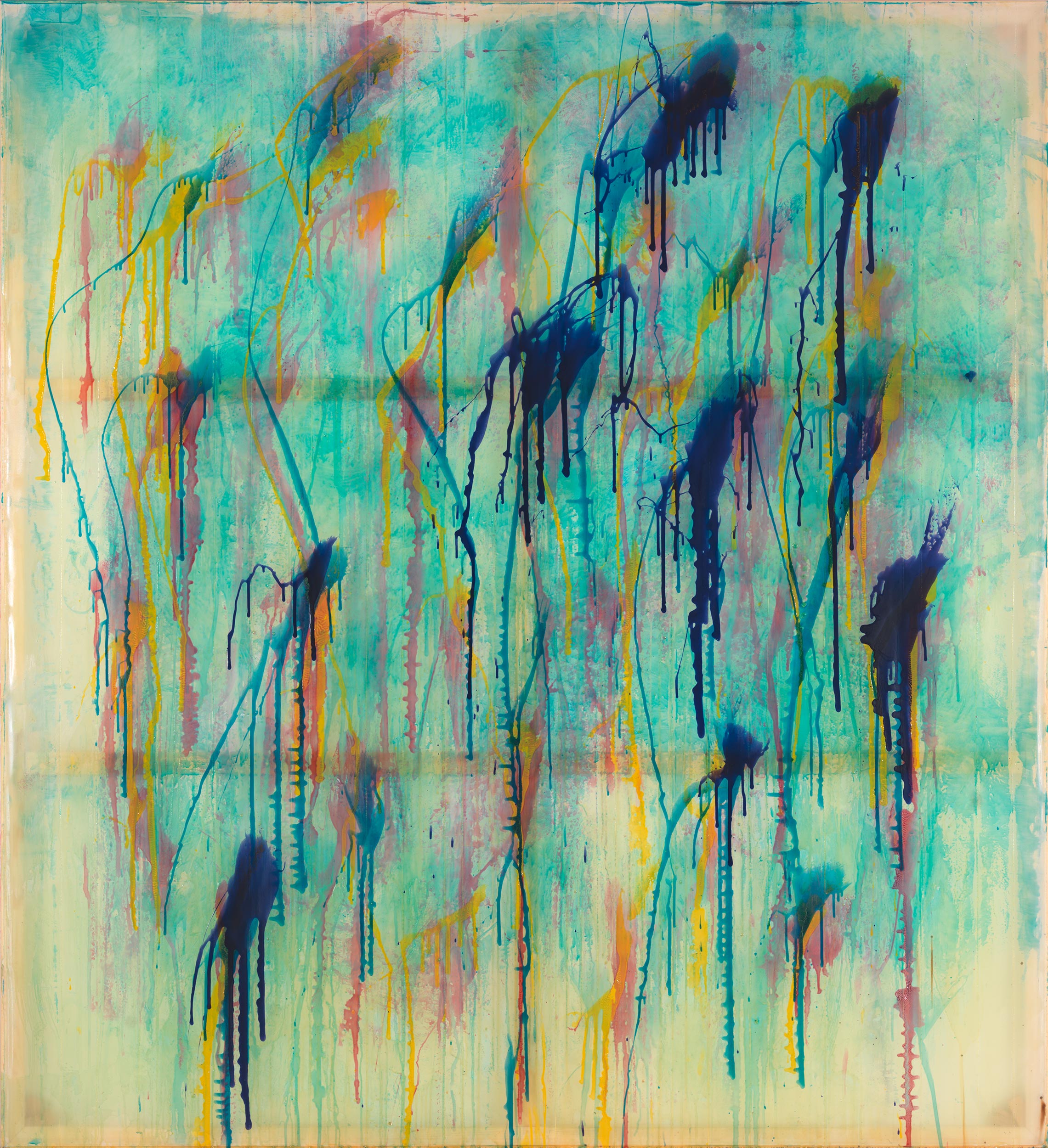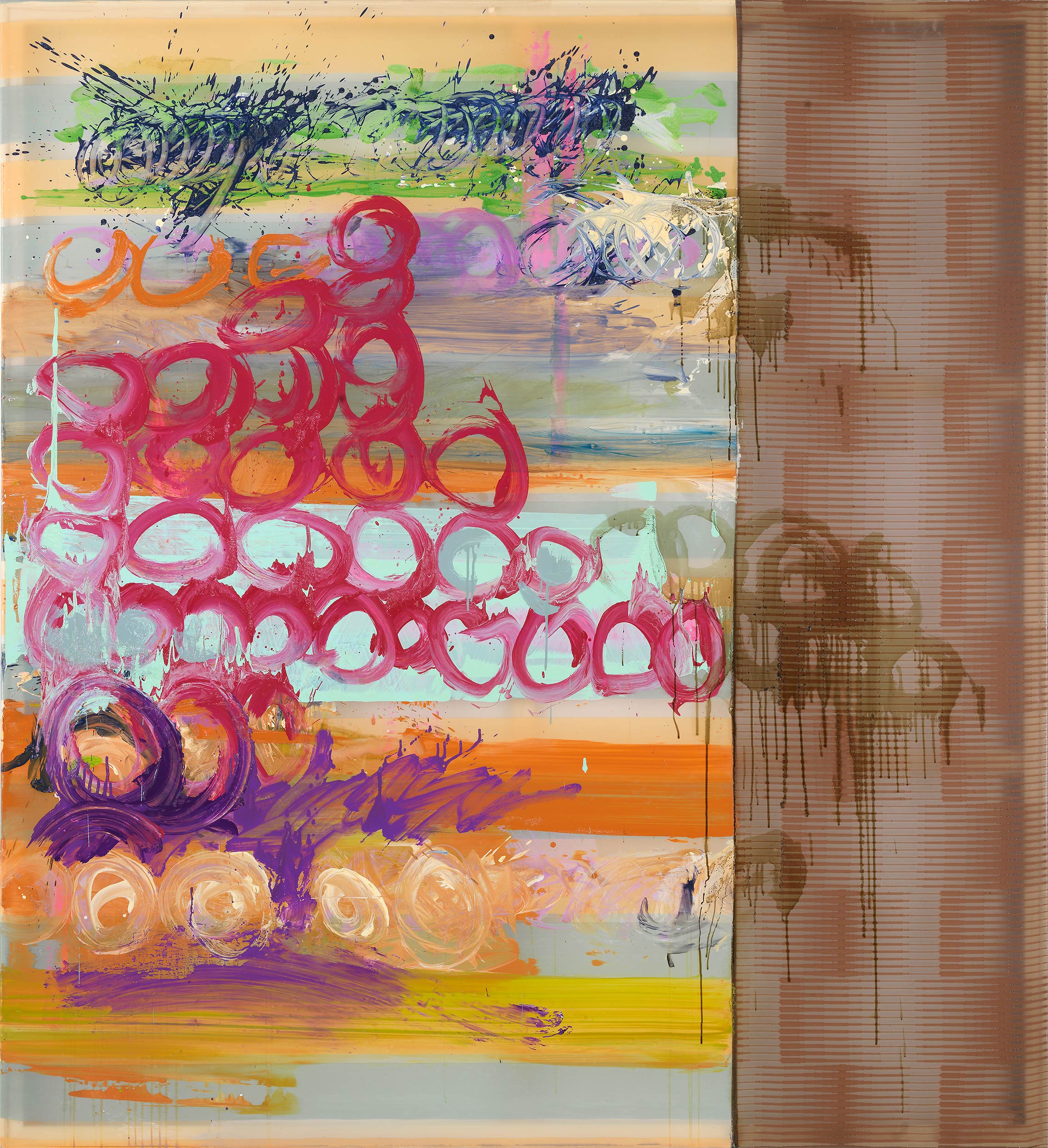 kreise in drei ebenen klekse, blau-rot-gelb streifen auf linie linien auf linie linien ausgegependelt schnelle kreise grüner regen